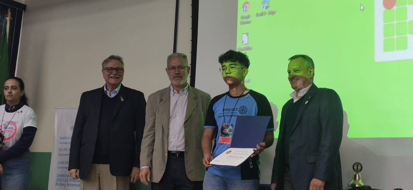 Sábado dia 11 de junho de 2022, na XXI CODIC “Conferência Distrital de Interact Club”, foi entregue o prêmio ao ganhador do 1º Concurso Distrital de Redação – Distrito 4510, o jovem Taylor Seiti Miada Ferreira. O Rotary Club Presidente Prudente Alvorada, representado nesta ocasião por Cirilo Cesar da Silva, Geraldo D. de Lima Paim e Plínio Ângelo Boin se sentiram honrados em fazer parte deste evento ofertando um título Paul Harris ao primeiro colocado, pois entende como muito valiosa esta interação.
